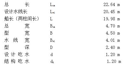 总长46.90m 型宽7.40m 型深3.55m 设计吃水1.60m