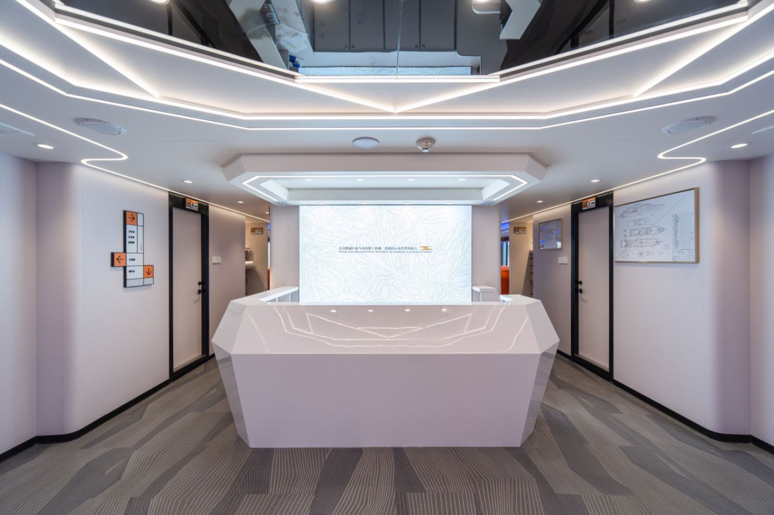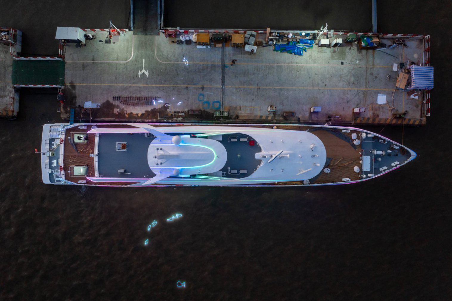 全船以白色为主的设计基调,完美融入花鸟岛浪漫爱情主题和海洋文化设计元素。船头采用独特弧线,塑造出轻盈动感、优雅迷人的形态;船身线条在不同面的重复组合下,宛如海鸥挥动的翅膀;科技感灯光的点缀,让船舶在夜晚极具浪漫、神秘和科技感。