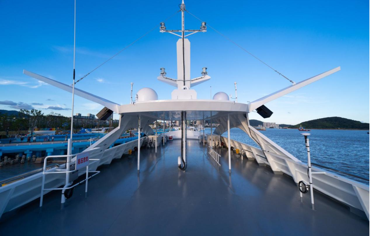 宽敞通透的客舱布局、人性化的座椅设计和全景舷窗,让乘客在享受高效通勤的同时,也能饱览东海碧波与星罗棋布的海岛自然风光。此外,船上还配备多功能室、娱乐甲板等活动空间,除满足日常的海上休闲娱乐、游览观光需求外,还可提供婚庆等特色服务,充分满足来花鸟观光旅游群体的多方面需求。